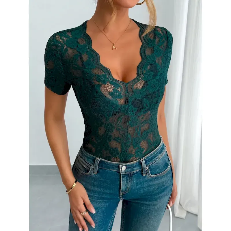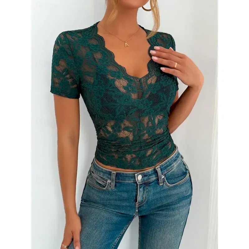 Women’s Blouse Lace Tops Solid Color Stylish Casual Short Sleeve V Neck Regular Tops Daily Lace Patchwork Black White Green Summer Spring 2025