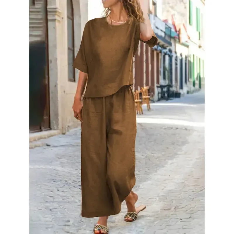 [Design Highlights] The top features elbow-length sleeves and a gently rounded neckline, adding a touch of understated elegance. The pants come with a flowy design and an elastic waistband, making them versatile for various body types and ensuring a flattering fit.