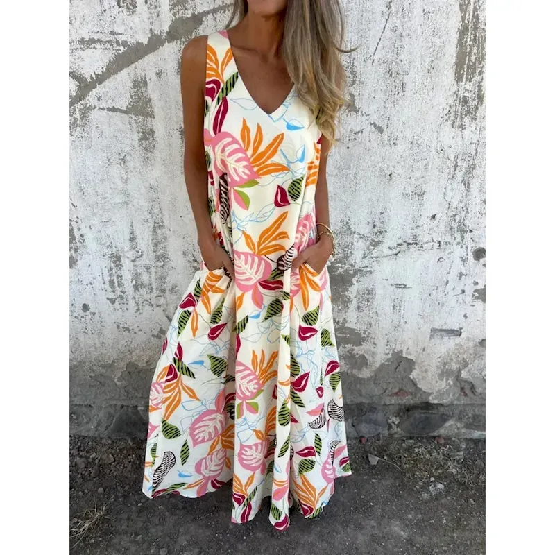 Women’s Maxi Dress A Line Dress Slip Dress Vacation Casual Boho Outdoor Going out Regular Fit Floral Sleeveless V Neck Blue Apricot Beige Summer 2025